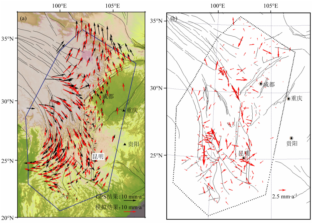 图 1a为模拟速度与GPS实测结果的对比,红色箭头显示的是模拟结果,其中大部分位于图 2a中的阴影区,为加载约束,位于断裂带附近的(图 2a的空白区)是实算结果.图 1b为模拟结果与GPS结果的残差分布.总体上看,模拟速度场的整体分布形态与实测GPS结果保持一致,表明加载计算客观反映了研究区断层运动的动力学条件.
