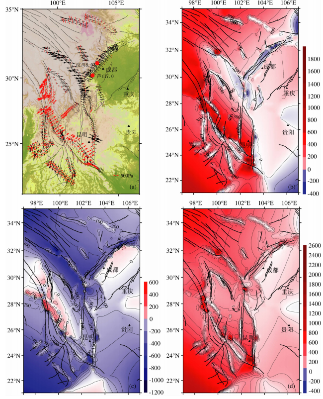 图 4(b、c、d)显示,研究区应力场呈非均匀分布,巴颜喀拉块体挤压、拉张均较高,其中龙门山断裂带附近挤压更为突出,其最大主张应力亦为负值;菱形块体东北部与西南部明显不同,分别呈现强烈挤压、强烈拉张;滇西南块体挤压和拉张量持平;四川盆地应力量值很小,说明该区域以刚性运动为主,变形很小.在块体衔接区,即龙门山、鲜水河、红河 等断裂带附近区域,应力变化剧烈,等值线沿断层 密集分布,形成梯度带,这一特征在图 4d中最为突出.在断层拐折区与交汇区出现局部应力集中区,应力值高于周边5~10倍,如小江断裂带中南部、玉树 与鲜水河断裂带交汇区、小江与红河断裂带交汇区等.