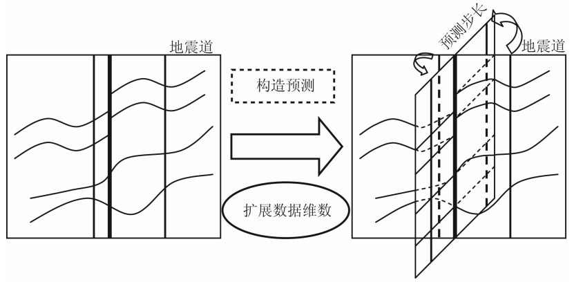2 理论基础提取构造信息是构造导向滤波的重要前提.Fomel(2010)提出了一种基于地震局部倾角的构造预测方法,倾角信息主要通过平面波分解滤波器(Plane-wave-destruction,PWD)刻画地震数据的局部平面波模型来求取(如附录A).通过这种算法,可以递归地从相邻地震道预测当前地震道,预测算子按照局部倾角模式提供原始地震道的平滑估计.此时,不同预测步长条件下的预测数据即可形成一个数据体,也就意味着给原始地震数据扩展了一个数据维数——预测步长(Liu et al., 2010),预测数据体将作为构造导向滤波和断层检测的输入.构造预测的基本流程如图 1所示.