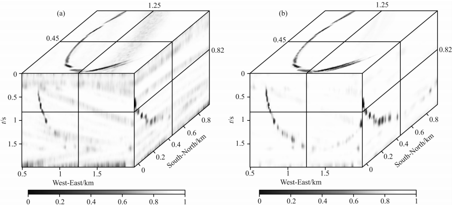 接下来测试本文的断层检测方法,首先以构造导向滤波结果(图 2c)作为输入数据,同时计算主测线和联络测线两个方向的同相轴倾角,并且选取1个预测步长距离的8个相邻地震道进行构造预测,为了保证断层的分辨率,此处的整形正则化算子的平滑半径减小到5个时间采样点,最终得到的断层位置如图 3a所示,从图中可以看到,非平稳穹隆状 断层所表现出的曲线特征和不同断距特点被清晰地指示出来,然而结果中仍然有一些连续地层的弱能量阴影.为了分析这个结果,进一步将理论无噪声数据(图 2a)作为检测对象,通过选取相同的参数,断层检测结果(图 3b)比较理想地显示出断层的位置.对比结果说明了剩余噪声对于本文断层检测方法有一定的影响,尽管如此,图 3a的结果仍然验证了本次研究提出的构造导向滤波和断层检测方法具有较好的工业可应用性.