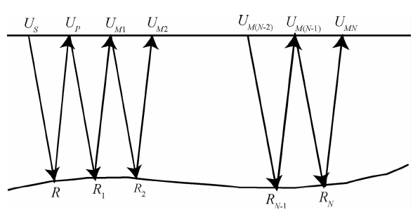 ,称为拟微分算子,从(2)式就可以推导出分步傅里叶与傅里叶有限差分等经典 的单程波的波场延拓算子(Stoffa et al., 1990;Ristow and Rūhl,1994). 图 1是多次波传播的路径图,其中US是震源波场,在地下R处发生第一次反射,UP是接收到的一次反射波场,一次反射波场在地表被接收后又被反射回地下,在R1处产生二次反射波,返回地表形成一阶多次波UM1,类似地产生一系列多次波,最大阶为N阶多次波UMN.在常规叠前深度偏移中,输入下行波场是震源子波,输入的上行波场是地表接收到的地震记录,一般认为多次波已经在前期预处理中被衰减掉,按照Claerbout教授的入射波的初 至与反射波的产生时间相同的成像原则(Claerbout,1971),当不存在多次波时,单程波偏移方法成像条件可写为