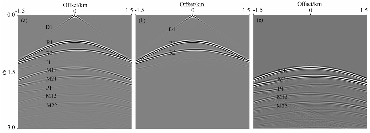 ![]() | 图 2 三层模型正演记录 (a)包含多次波的单炮记录;(b)一次波记录;(c)多次波记录.Fig. 2 Forward shot gathers of a three-Layer velocity model (a)Single shot gather with multiples;(b)Primaries;(c)Multiples. |
