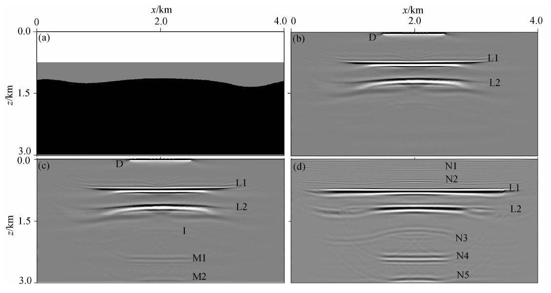 图 3b是应用去除多次波后的记录(图 2b)做的单程波叠前深度偏移,第一反射层界面L1与第二个反射层界面L2都得到了正确的成像,而且偏移噪音很小.应用包含多次波炮集数据进行单程波叠前深度偏移的结果如图 3c所示,虽然可以正确成像L1与L2层界面,但是,由于多次波的存在产生了严重的偏移假象,其中,I是由震源子波延拓的下行波场与层间多次波延拓的上行波场I1产生的偏移假象;M1与M2分别是震源延拓的下行波场与第一层界面和第二层界面对应的地表相关一阶多次波M11和M12延拓的上行波场产生的偏移假象.图 3d是应用本文方法得到的多次波成像结果,其中,N1是层间多次波I1与第一个反射层的一阶地表相关多次波M11得到的偏移假象;N2是第二层的反射波R2与第一反射层的一阶地表相关多次波M11得到的偏移假象;L1是实际反射层的成像,它的成像贡献来自多个上、下行延拓波场的相关叠加,包括第一层的反射波R1与第一层的一阶地表相关多次波M11的相关成像、第二层的反射波R2与第二层 的一阶地表相关多次波M21的相关成像、第一层的一阶地表相关多次波与第一层的二阶地表相关多次波的相关成像、第二层的一阶地表相关多次波与第二层的二阶地表相关多次波的相关成像等,也就是式(5)中的第Ⅲ部分.类似地,L2层的成像由第二层的一次反射R2与第二层的一阶多次波、第二层的一阶多次波与第二层的二阶多次波等相关成像得到,这就是为什么多次波相对于一次波具有很广照明范围的原因,明显的表现就是图 3d中L1层成像范围大广于一次波对L1层成像(图 3c)的原因.N3、 N4和N5都是偏移假象,如式(5)中的第Ⅳ部分所示.