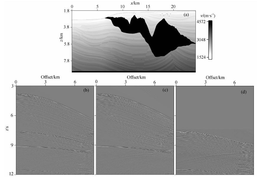 ![]() | 图 4 Sigsbee2B模型速度场与单炮记录(a)速度-深度模型;(b)包含多次波的单炮记录;(c)去除地表相关多次波后的单炮记录;(d)地表相关多次波.Fig. 4 Sigsbee2B velocity model and single shot record(a)Velocity-depth model;(b)Single shot record including multiples;(c)Single shot record after multiples elimination;(d)Surface-related multiples. |