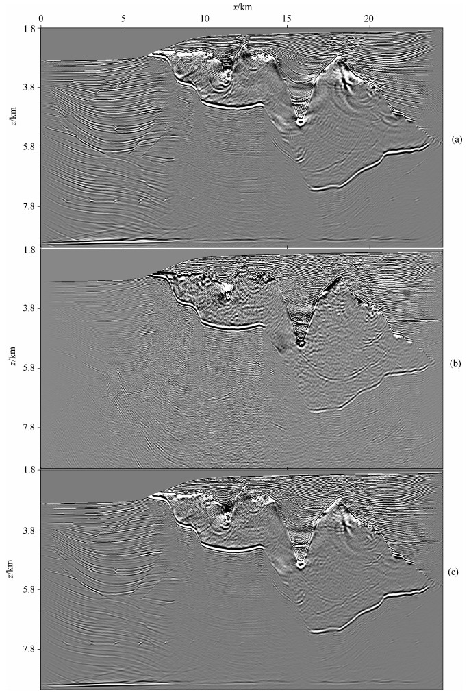 ![]() | 图 5 Sigsbee2B模型叠前深度偏移结果吧(a)一次波叠前深度偏移;(b)多次波叠前深度偏移;(c)一次波与多次波成像结果匹配叠加.Fig. 5 Pre-stack depth migration results of Sigsbee2B model(a)Pre-stack depth migration with primaries;(b)Pre-stack depth migration with multiples;(c)Matched stack of pre-stack depth migration of primaries and multiples. |