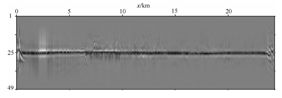 近年来,随着计算机硬件的发展,逆时偏移得到了一定程度的应用,Liu等(2011)将逆时偏移震源波场用地震记录来替代、记录波场用预测出的多次波来替代实现了基于逆时偏移的多次波成像,取得了较好的效果,然而由于逆时偏移本身的特点,这种 计算方法也是比较耗时的.Zhang和Schuster(2014)提出了基于最小二乘的多次波逆时偏移方法,通过多次迭代运算,改善了逆时多次波偏移方法的成像质量,在照明均衡和纵向成像分辨率方面都有了明显的提高.Wang 等(2014)提出了一种不需要预先预测多次波的方法,以脉冲震源与原始记录为下行延拓初始波场,以原始记录为初始上行波场,避免了多次波预测所增加的误差.郭书娟等(2011,2012)提出了基于广义的炮偏移方法实现地表多次波和一次波的联合成像,该方法是将包含有震源的记录波场做为下行波场,多次波为上行波场来实现一次波与多次波的联合成像,由于震源子波包含在记录波场中,如果子波能量太小,一次波成像比重就较小,如果子波能量太强,多次波成像比重就掩盖了一次波成像,所以在确定震源子波能量上存在一定的困难.
