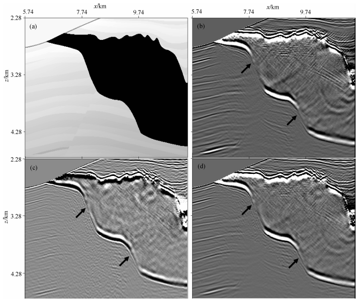![]() | 图 7 Sigsbee2B模型盐丘边界处叠前深度偏移 (a)速度模型;(b)一次波叠前深度偏移;(c)多次波叠前深度偏移;(d)一次波与多次波成像结果匹配叠加.Fig. 7 Salt boundary pre-stack depth migration of Sigsbee2B model (a)Velocity model;(b)Pre-stack depth migration of primaries;(c)Pre-stack depth migration of multiples; (d)Matched stack of pre-stack depth migration of primaries and multiples. |