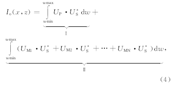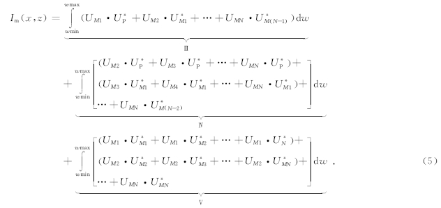 在时间域相关的两个信号,在频率域是一个信号与另一个信号复共轭的标量积.式(5)中的复共轭项代表了下行波场的正向外推,非复共轭项代表了上行波场的反向外推.整个多次波成像由三部分构成,第一部分Ⅲ项是多次波真实构造成像部分,认为地表接收到的第N-1阶多次波UM(N-1)为震源波场,经地层界面RN反射后,在地表接收到的第N阶多次波为该源产生的记录波场UMN,上、下行波场通过互相关成像得到RN位置的成像值,根据第Ⅲ项,依次可以得到R1,R2…,RN-1位置处的成像;第二部分Ⅳ项是多次波偏移中产生的噪音,成像条件中的UM(N-2)和UMN分别是下行波场与上行波场,虽然能够成像,但是所成的像是偏移假象或噪音,因为在UM(N-2)与UMN之间还有一次波场的往返,而单程波叠前深度偏移并没有考虑到这种往返,还是按照单程波场延拓的方式来延拓波场,在比实际反射层更深的地层处相关成像,产生偏移假象或噪音;第三部分Ⅴ是不能够产生成像值的,以UMN·U<sub>MN为例,因为下行波场UMN的正向延拓意味着波前面时间在变长,而上行波场UMN的反向延拓意味着波前面时间在变小,两者随着波场延拓是不可能相遇并相关成像的,由于没有偏移噪音产生,这部分对偏移成像影响不大.
