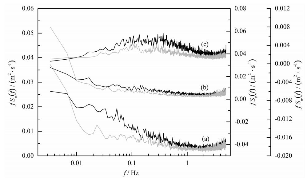 图 9 EC观测的三维风速平均功率谱 (a)u谱;(b)v谱;(c)w谱. u、v和w分别表示平均气流方向、横风方向 和垂直方向的风速分量;图中黑色和灰色线条分别表示LLJ存在与否的情形. Fig. 9 The average of power spectra for(a)u,(b)v and (c)w u,v and w represent velocity component in mean flow direction,cross wind direction and vertical direction, respectively;black curves indicate the situation with presence of LLJ,while gray curves indicate that with no LLJ. |