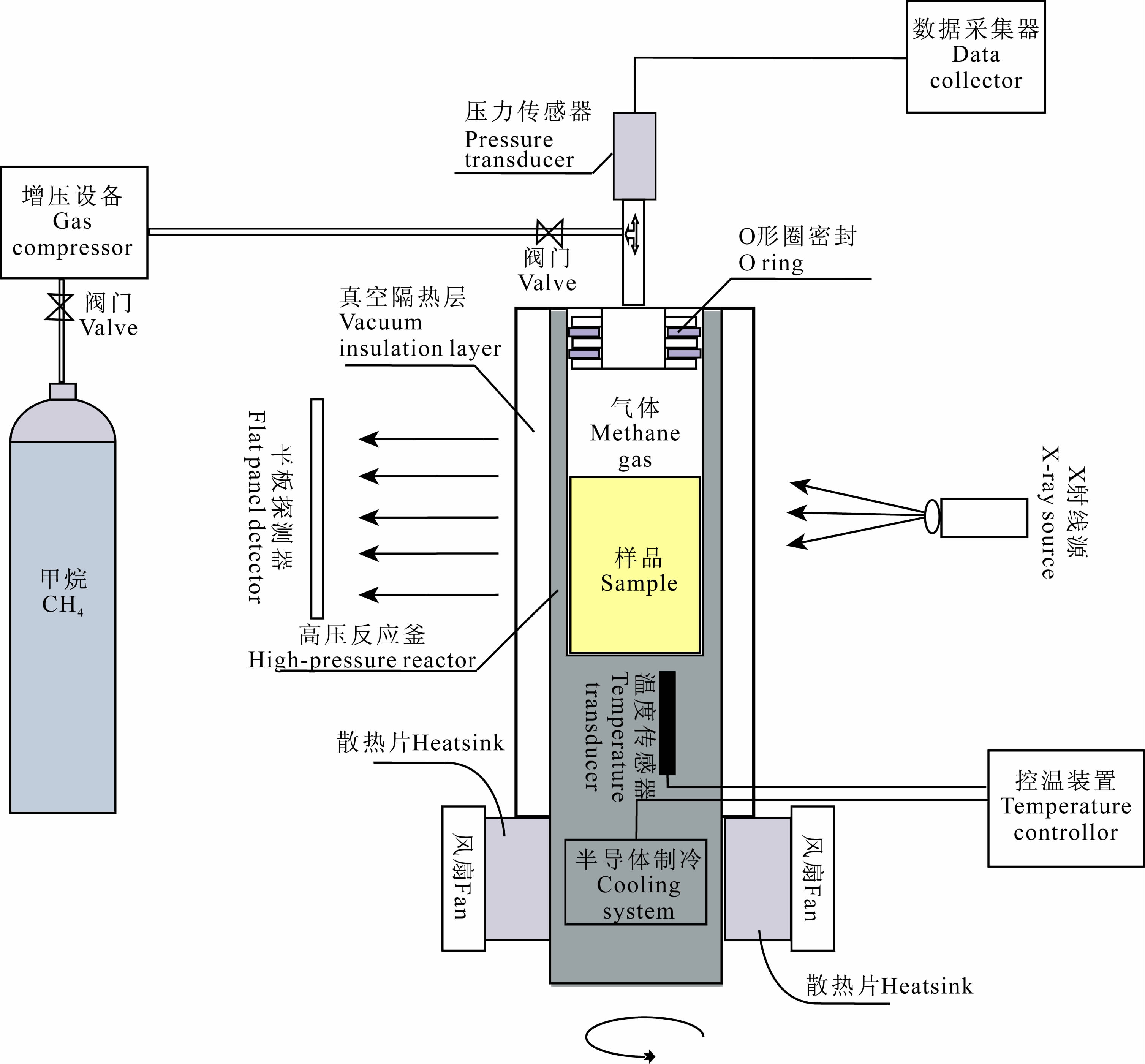 现有的水合物微观分布特征大多为假想模式,主要由声学探测和热学探测等手段推测得出(Hu et al., 2010; 2014; 胡高伟等,2010; 2012; Huang et al.2005),具有很大的不确定性.例如,英国南安普顿大学采用共振柱装置,研究了“过量气”、“过量水”和“溶解气”等气体供应方式下水合物的声学响应特征,推测上述几种方式下形成的水合物分别对应水合物胶结沉积物颗粒、水合物接触沉积物颗粒和水合物呈悬浮状态三种微观分布状态(Priest et al., 2005; 2009; Best et al., 2013);青岛海洋地质研究所采用地球物理模拟实验装置,根据获取的声速与水合物饱和度关系推测水合物在固结沉积物中先以悬浮状态生成,随后再胶结沉积物颗粒生成(Hu et al., 2010; 业渝光等,2008).X射线断层扫描技术(X-CT,X-Ray Computerized Tomography)为沉积孔隙中水合物微观分布的直接观测提供了可能途径.早期的水合物CT研究主要利用CT数(指CT图像生成的直接数据,表示了物质的密度关系)研究水合物形成、分解过程(吴青柏等,2006; 蒋观利等,2005).蒋观利等(2005)观测了甲烷水合物生成、分解过程中CT数变化情况,结果表明,随着水合物的生成,CT数由最初较小的数值逐渐增大,最高时可达-125左右.随着高精度X-CT的引进,含水合物沉积物的微观分布逐渐得到了较好的诠释,其研究可分为两类:第一类主要针对冻结的水合物样品,通常在常压下进行试验.例如,Jin等(2004)采用Shimadzu SMX-225CTS-SV型微型CT在-100 ℃的条件下研究了含水合物沉积物的物质分布特征,结果表明,由获取的二维和三维CT影像图可清楚地显示沉积物中游离气、“水合物+冰”和沙粒的空间分布位置;Murshed等(2008)利用同步加速器产生的X射线对冰冻的水合物样品做了更为精细的研究,通过对墨西哥湾水合物样品进行二维图像分析,认为可利用CT图像特征来区分冻结沉积物中的水合物和冰,并可根据冰内是否包含盐类颗粒,判断冰是纯水(即水合物分解所产生的水)结冰或是海水结冰.然而,同步加速器X射线源较为难求,研究成本较高;Jin等(2004)的研究结果并未区分出水合物和冰,即未能揭示孔隙中水合物的微观分布状态.