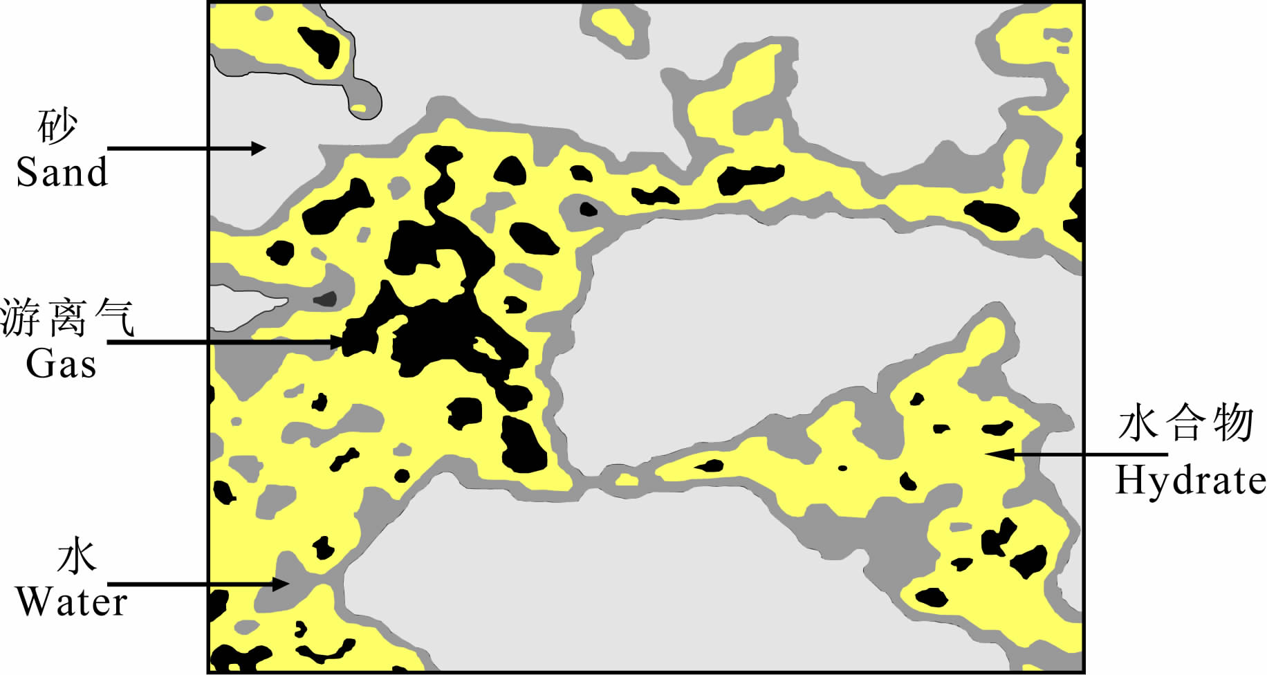 ![]() | 图 3 Jin等(2006)获取的含水合物沉积物微观分布图 黄色为甲烷水合物; 灰色为NaCl溶液;浅灰色为石英砂;黑色为甲烷气. Fig. 3 Pore scale distribution of gas hydrate in sediments obtained by Jin et al. 2006 The yellow is methane hydrate; The gray is NaCl solution; The light gray is s and s; The black is methane gas. |