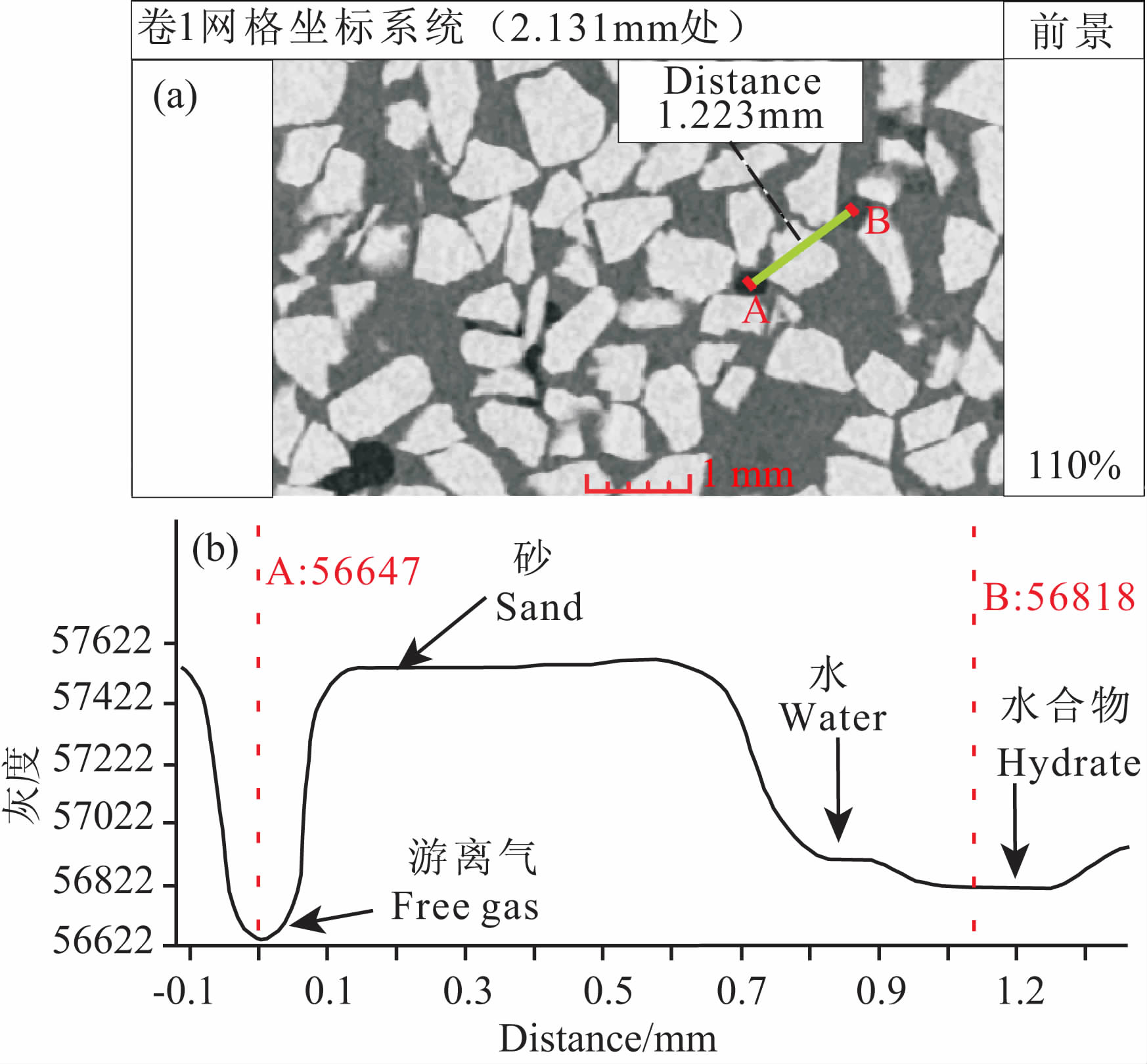 本研究工作利用高精度CT仪器(Hu et al., 2013),采用水合物标定法等方法(李承峰等,2013)提高了对含水合物沉积物中各物质组分的分辨能力.获取的含水合物沉积物样品灰度直方图见图 2c,图中可见三组明显的灰度峰,其中中间一组灰度峰明显由两种物质叠加,这是因为水和水合物的灰度值较为接近所致.对原始CT图像中选取的从A到B段(距离1.223 mm,图 4a)进行灰度剖面分析表明(图 4b),样品中游离气、砂、水合物和水的灰度差异可明显区分开来.例如,A点代表游离气所在位置,其灰度值为56647;而B点则代表水合物所在位置,其灰度值为56818.因此,根据上述方法可获取各物质组分的灰度值,从而获得实际观测的水合物微观分布模式(图 5b).