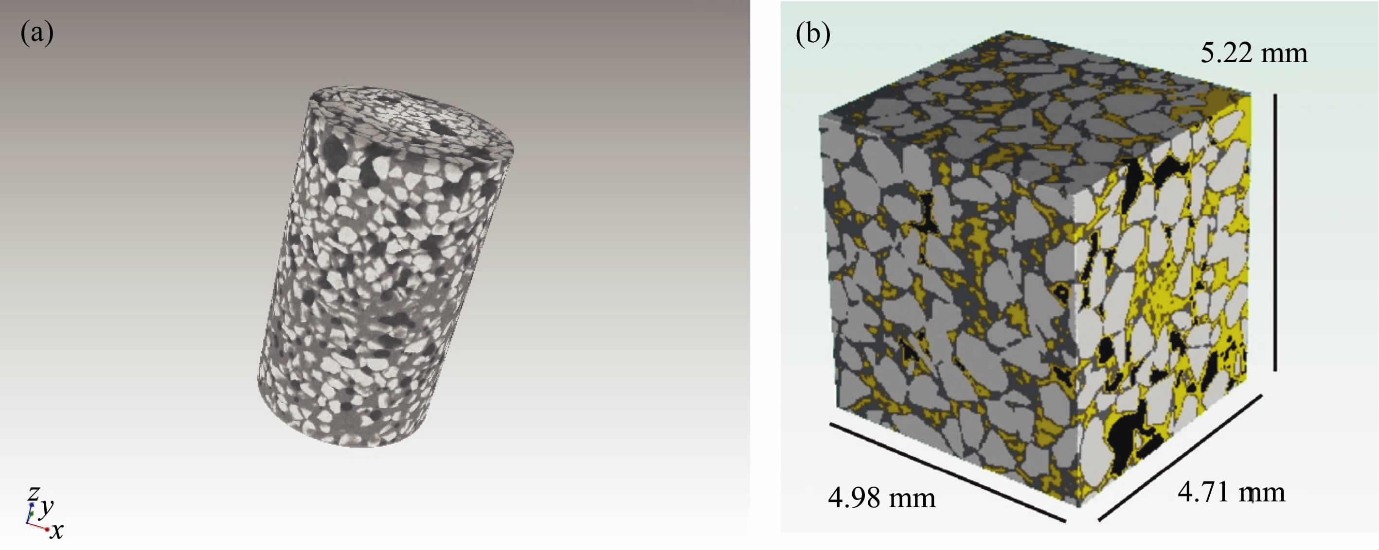 ![]() | 图 6 整体样品和选取区域的三维CT图像 (a)整体样品三维图;(b)选取区域三维图. 黄色为甲烷水合物; 灰色为NaCl溶液;浅灰色为石英砂;黑色为甲烷气. Fig. 6 3D image of the whole sample and the selected area (a)Whole sample;(b)Selected area. The yellow is methane hydrate; The gray is NaCl solution; The light gray is s and s; The black is methane gas. |