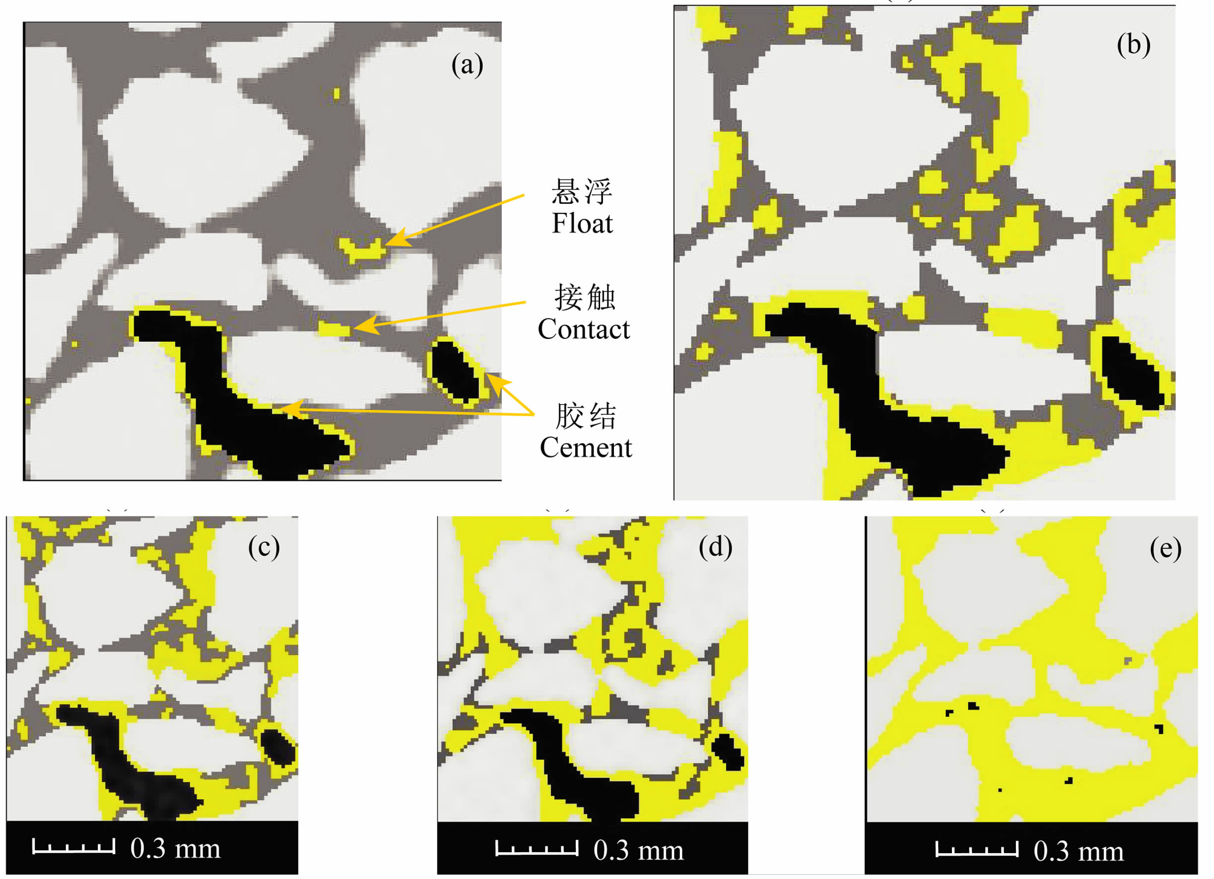 在水合物形成过程中,对选取的剖面(图 5)在不同时刻的微观分布进行了观测(图 7).结果表明,沉积物孔隙空间中水合物形成并非单一模式,在同 一时刻水合物可能出现“悬浮”(即水合物在孔隙流 体中)、“接触”(水合物与沉积物颗粒呈接触状态,但未胶结沉积物颗粒)和“胶结”(水合物类似胶结物,将多个沉积物颗粒粘结在一起)的混合模式.但在不同水合物形成阶段,水合物微观分布以其中某种模式为主导:形成初期水合物以胶结模式为主;中期以悬浮状态为主;后期又以胶结模式为主.