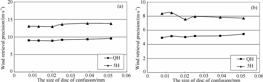 ![]() | 图 3 像元合并前(a)后(b)成像系统焦距对测风精度的影响 Fig. 3 Effects of the focal length on the wind retrieval with binning(b) and without binning(a) |
