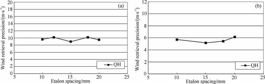 ![]() | 图 6 标准具间距并前(a)和2×2合并后(b)对热层大气风速测量精度的影响 Fig. 6 Effects of etalon spacing on the wind retrieval with binning(b) and without binning(a) |