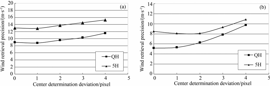 图 7给出了干涉环中心确定偏差对风速反演精度的模拟计算结果.可以看出,在像元合并前,干涉环中心偏差3个像元对测风精度的影响仍在10%左右,到4个像元影响也不大于30%;而在采用2×2像元合并后,由于像元尺度增大了一倍,其中心确定偏差影响也增大,即当干涉环中心偏差2个像元其对测风精度的影响增加小于25%,但当偏差4个像元时测风精度将降低1倍.为此,在风速反演中要求干涉环中心确定误差<0.05 mm.