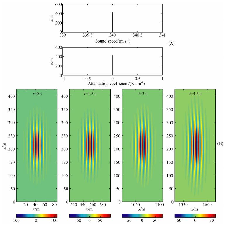 由图 2A给出的背景可知,声速剖面为固定值,且声波衰减系数为0.根据经典射线理论,在无耗散的均一理想大气中传播,声波的轨迹将为一条直线,声波的衰减也仅是由于声波在空间中的几何扩散所引起的.这些理论上描述的声波行为与图 2B所给出的声波波包的模拟结果一致.