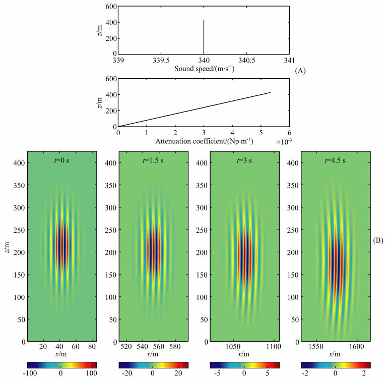 与图 2B类似,从图 3B的纵轴和横轴的信息中,可以确定地看出波动在水平上产生的位移和由 几何扩散带来的波包波形的延展.由于介质变为有耗散介质,声波不仅要受到几何扩散带来的能量衰减,同时受介质耗散的衰减作用.图 3B与图 2B相比,在对应的1.5 s、3 s和4.5 s,图 3B中声波波包的声压明显弱于图 2B中的声压.但是,与图 2B相比,图 3B中的波包声压幅度较大的部位呈现出随着声波传播时间的推移逐步下降的趋势,同时图 3B中波包出现了与图 2B不同的形态.在0 s时刻,声 波波包的声场图显示声压的对称中心在200~250 m 之间,当波包传播了4.5 s之后,声波波包的声压中心在150~200 m之间,产生了明显的下移.这是由于背景介质的衰减系数随高度增加,声波波包上部的背景衰减系数较大,而波包下部的背景衰减系数较小,在波包的传播过程中,波包上部所衰减的能量比下部所衰减的能量大,声波波包下部的声压幅度渐渐强于上部的声压,所以总体而言,声波波包的能量的中心产生了下移. 4.1.3 均一耗散系数的情况