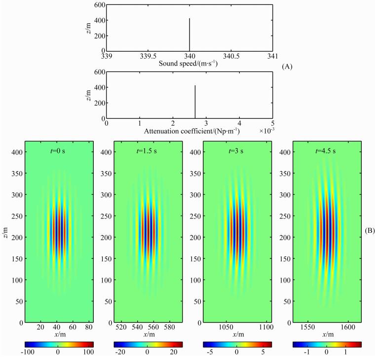 衰减系数和声速的剖面在图 3A中给出.根据不考虑耗散作用的经典射线理论,声波传播的路径由绝热声速剖面和风速剖面决定,在图 3A给出的背景中,温度恒定,没有风场运动的干扰,声波传播理论上也应该为水平传播的直线.但是在图 3B中,模拟结果显示出了与经典射线理论不同的现象.