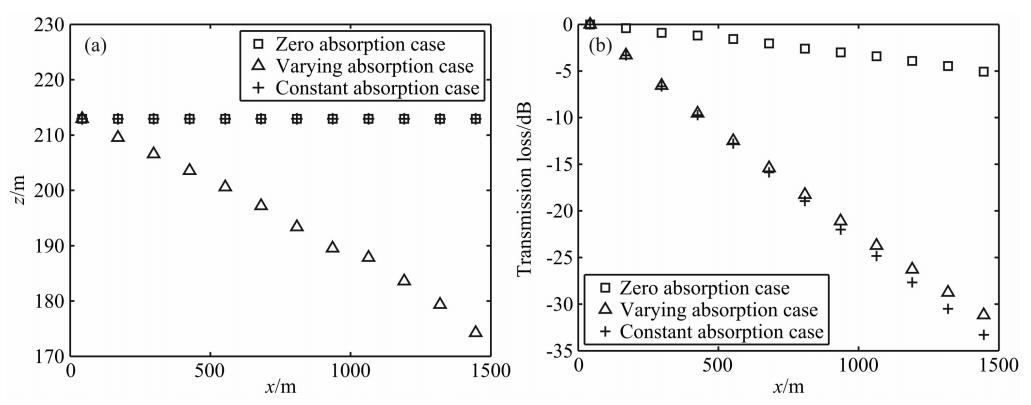 耗散系数随高度变化的剖面构造如下,令耗散系数为b=0.01z m2/s,根据声波衰减理论,声波衰减系数α可以表示为