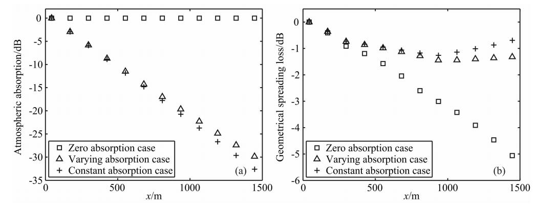 图 6(a)大气声吸收随传播距离的变化;(b)几何扩散损耗随传播距离的变化 Fig. 6(a)Atmospheric absorption versus propagation distance;(b)Geometrical spreading loss versus propagation distance |
