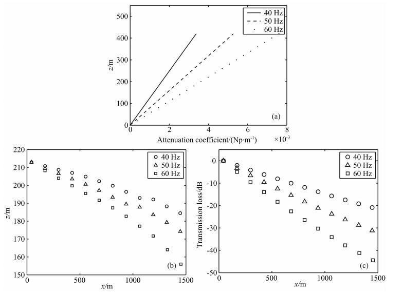 由声波衰减系数的表达式方程(16)可知,声波衰减系数与声波频率的平方成正比.图 7a给出了耗散系数随高度变化背景下,三个频率声波衰减系数的剖面.从图 7a中可以看到,同一耗散系数剖面下,不同声波衰减系数的斜率各不相同,从大到小排序,依次为60 Hz,50 Hz和40 Hz.结合4.1.2节中图 3所给出算例,我们知道声波波包在传播过程中,由于声波衰减系数随空间变化,衰减系数的斜率不为零,波包上部和下部受到的衰减存在着差异,导致了波包能量中心的偏移.很显然,声波衰减系数的斜率越大,波包上部和下部所受的衰减差异也越大,波包能量中心偏移的趋势就越强,在传播了一定距离后,其能量中心的偏移量也就最大.