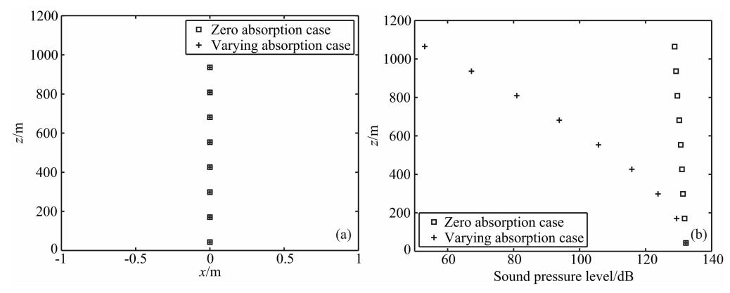 图 8(a)声波竖直向上传播时的轨迹;(b)声波竖直向上传播时,波包中心处的声压级随高度的变化 Fig. 8(a)The trajectory of acoustic wave in vertical propagation;(b)The sound pressure level at the center of the packet varies with height |