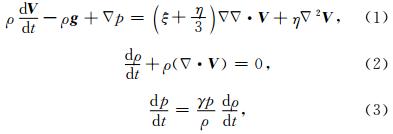 .(1)式为大气中的Navier-Stokes方程,(2)式为连续性方程,(3)式为描述绝热过程的状态方程. p、ρ和V 分别代表大气的压强、密度和运动速度,ξ和η分别表示切变和体积黏滞系数,