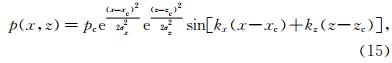 式(15)中pc和(xc,zc)分别为声波波包中心的声压幅度和位置;σx和σz分别为波包在水平方向和竖直方向的半宽度; kx和kz分别为声波波包波数的水平分量和竖直分量.在模拟中,设定频率为50 Hz的声波波包水平发射,发射角度为0°,则有kx=0.924,kz=0;在计算中为了精确刻画声波的传播过程,取Δx=Δz=λ/16,λ=6.8 m,为声波波长,即在水平方向上或竖直方向上,一个声波波长的尺度内有16个网格点.