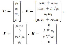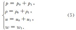 在水平分层的假设下对方程组做简化处理,忽略背景大气中竖直方向上的对流运动,将方程中的压强p,密度ρ和流体速度 V =(u,w)分解为背景值(使 用下标0标注)和声波扰动值(使用下标1标注)之和: