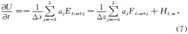 首先应用7点中心差分的保色散关系对声波传播控制方程(6)进行空间差分,得到