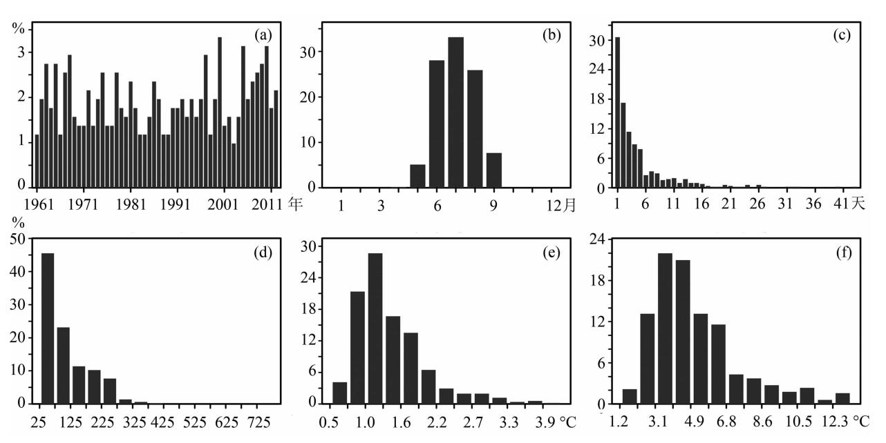 图 5 1961—2012年群发性高温事件频率分布图 (a)发生年份;(b)发生月份;(c)持续天数;(d)影响站数;(e)平均强度;(f)极端强度. Fig. 5 Frequency percentage distributions of all cluster high temperature events from 1961 to 2012 according to different indices (a)Occurring year;(b)Occurring month;(c)Lasting days;(d)Affected stations;(e)Average intensity;(f)Extreme intensity. |