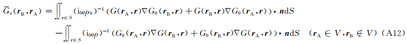 =0.用背景波场和实际波场的褶积,当rA和rB都在体V内时,可用(A10)式计算积分面上介质差异所产生的散射波.对于第二种情况,当rA在体V内、rB在体V外时,将(A1)和(A4)式相加,得