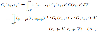 现在关注两种情况,一是rA和rB都在体V内(rA,rB∈V),这时(A1)和(A3)式严格成立;二是rA在体V内、rB在体V外(rA∈V,rBV),这时(A1)和(A4)式严格成立.这些公式由面积分和体积分组成,其中体积分中涉及到背景介质与实际介质的参数差异.(A2)和(A4)式反映了面积分和体积分之间关系.