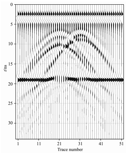 探地雷达亦即地质雷达是利用高频电磁波在地下介质中的传播、反射及绕射等波动现象和规律的地球物理探测方法,能提供有关近地表介质特性和结构的高分辨率信息.探地雷达已广泛应用于地质(Davis and Annan, 1989;Liner and Liner, 1997)、环境(Beres and Haeni, 1991)、水文(Arcone et al., 1998)、工程(Morrow and Genderen, 2002;Xu et al., 2002;Lee et al., 1987)、考古(Zhou and Sato, 2001,2004;Zhou et al., 2005;冯暄等,2011)和军事(Gader et al., 2001)等领域.