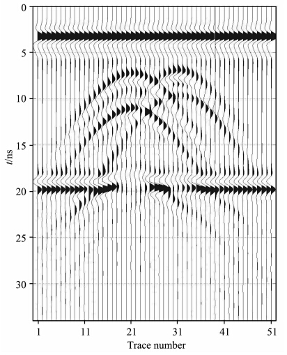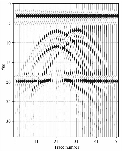 ![]() | 图 5 用激发脉冲2及单天线激发接收的雷达剖面(作为模拟资料)Fig. 5 A radar profile obtained by using pulse 2 and single transmitting antenna and single receiving antenna(It is taken as simulated data) |
