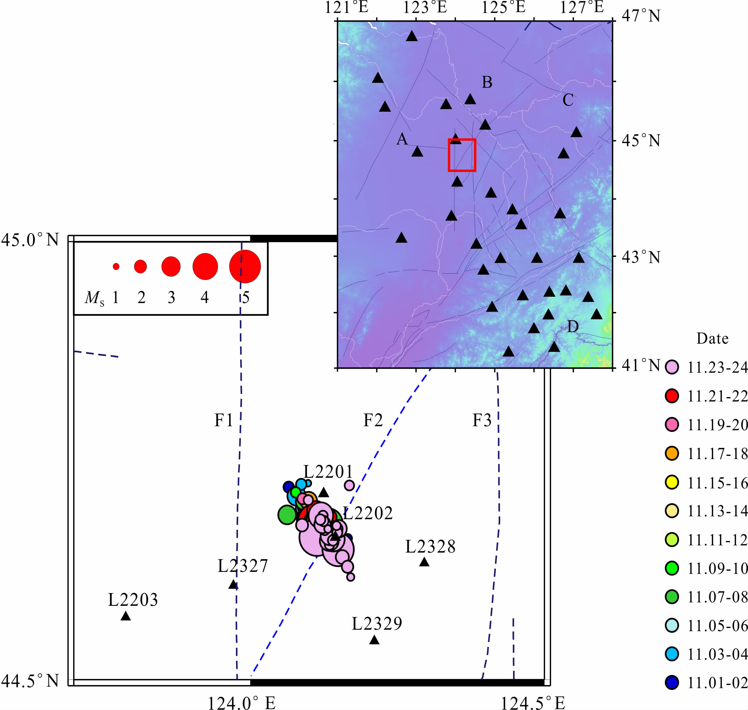 2013年10月31日前郭地区先后发生MS5.5级、5.0级地震,距离震中最近的台站是约50 km的QAT,CLT台(图 1),这两个台站并不能满足地震精定位以及后期相关研究的需要.为了更好地监测地震活动以及后续的地球物理研究工作,需要在震 源区小范围内布设流动台站组成的地震监测网.吉林省地震局和黑龙江省地震局迅速在震源区架设7 个流动地震台(L2201,L2202,L2203,L2204,L2327,L2328,L2329)进行地震数据的观测记录,7个流动台站密集地分布在震中周围,很好地覆盖了11月接连不断发生的地震簇.这7个流动台站均采用CMG-40TDE一体化短周期地震计,频带范围为1~40 Hz,采样率均为100sps.