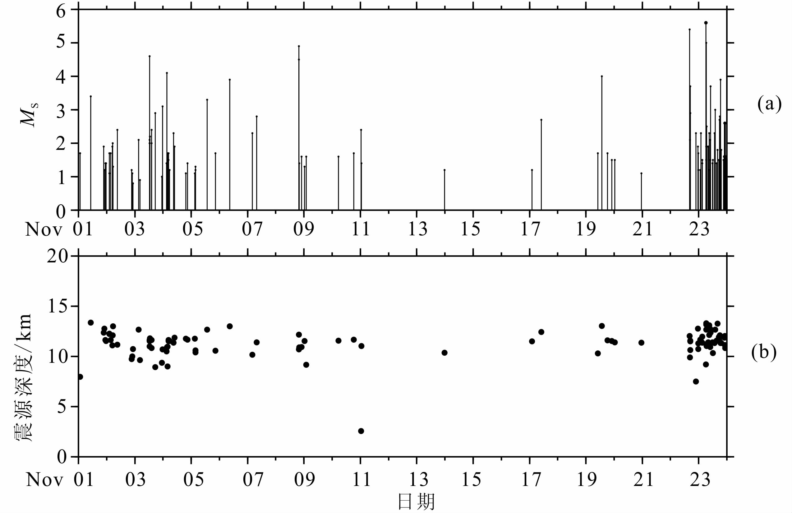 ![]() | 图 2 2013年11月前郭地区地震序列时序图(a)和震源深度分布图(b) Fig. 2 The M-T figure(a) and depth figure(b)of the earthquakes in November,2013 at Qianguo area |