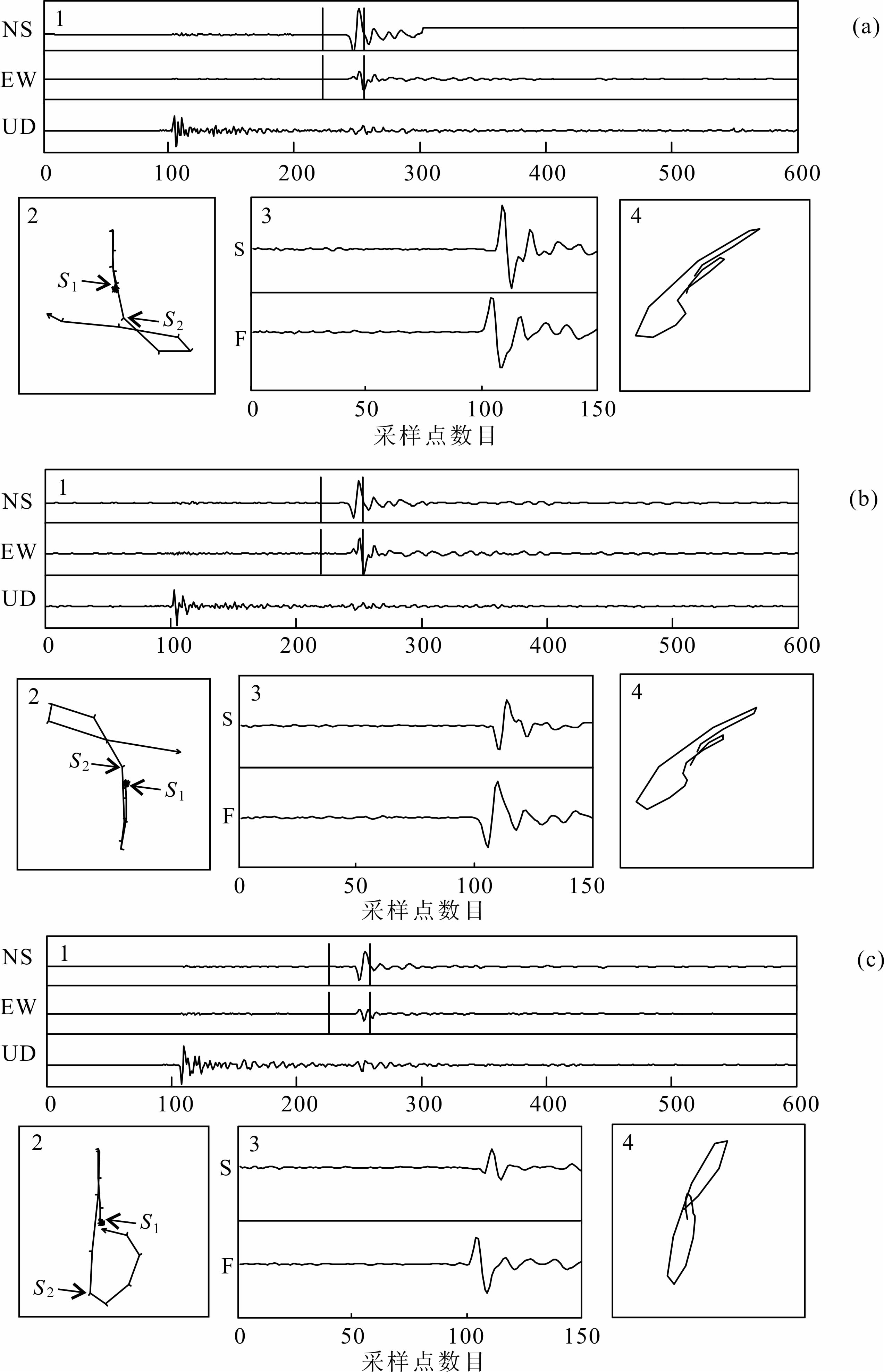 ![]() | 图 3 L2202台记录的地震数据的剪切波分裂分析 (a)(b)(c)分别为数据20131101144841,20131104113350,20131123154934所得到的结果.1 南北向(NS)、东西向(EW)和垂直向(UD)的地震波形记录,竖线是用来做质点偏振图的剪切波段;2 截取的剪切波的质点偏振图,S1为快剪切波的到时;S2为慢剪切波的到时; 3 快(F)、慢(S)剪切波的波形图;4 经过时间延迟校正的快慢波质点振动图. Fig. 3 The shear-wave splitting analyzing of the earthquakes recorded by station L2202 (a)(b)(c)are the analyzing results of the event No. 20131101144841,20131104113350,20131123154934,respectively. 1 is the waveforms at north-south,east-west and vertical direction respectively. Two vertical short lines point out the scope of shear-wave showed in polarization figure. 2 is the trail of particle of the cut shear-wave. S1 is the time of fast shear-wave arrival; S2 is the time of slow shear- wave arrival. 3 is the waveforms of fast and slow waves; 4 is the trail of particle of fast and slow wave after time-delay correction. |