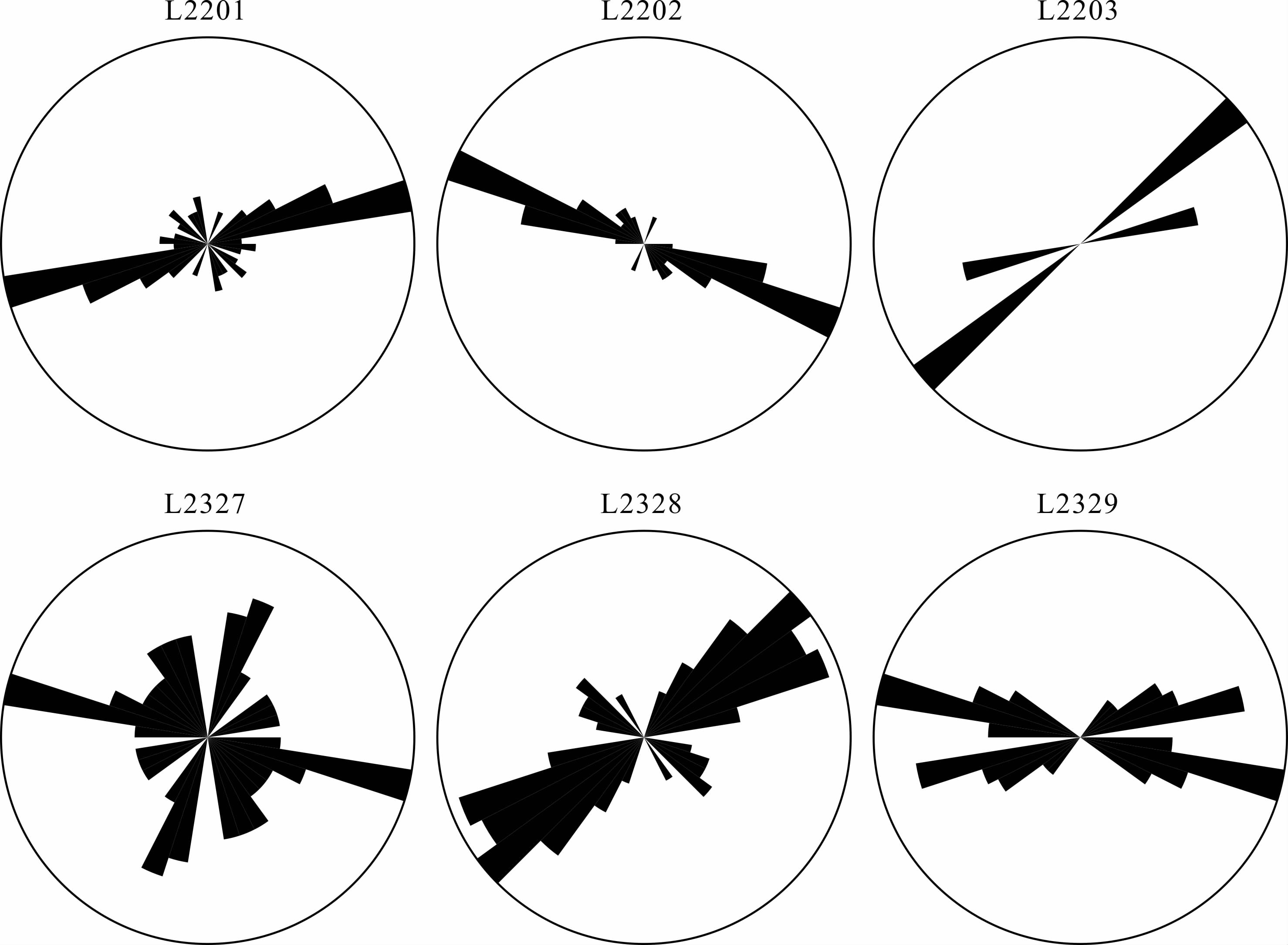 总体来看,该研究区域的快波偏振方向有两个,分别为北东向和北西向.L2201台记录的符合剪切波分裂分析的事件有71条,其中61条数据的快波偏振方向结果显示为北东向,只有10条数据结果显示为北西向.L2202台站有86条结果的快波偏振方向为北西向,只有一条结果显示为北东向.L2203台距离震源分布较远,只有4条事件数据满足剪切波分裂分析的要求.虽然数据较少,但是结果显示一致为北东向.L2328台的结果显示有65条快波偏振方向为北东向,只有9条结果为北西向.以上可以看出L2201,L2202,L2203和L2328台站的结果虽然有两个快波偏振方向,但是分布在两个方向的结果数目比例悬殊较大,所以这四个台站的快波偏振方向优势取向较为明显.等面积投影玫瑰图也显示这四个台站的快波偏振方向优势取向较为明显(图 4).L2327共有31条结果,其中20条结果快波偏振方向为北西向,11条结果为北东向.L2329台站有24条结果为北东向,33条结果为北西向.L2327和L2329这两个台站的快波偏振方向优势取向不太明显,有北东向和北西向两个快波偏振方向.