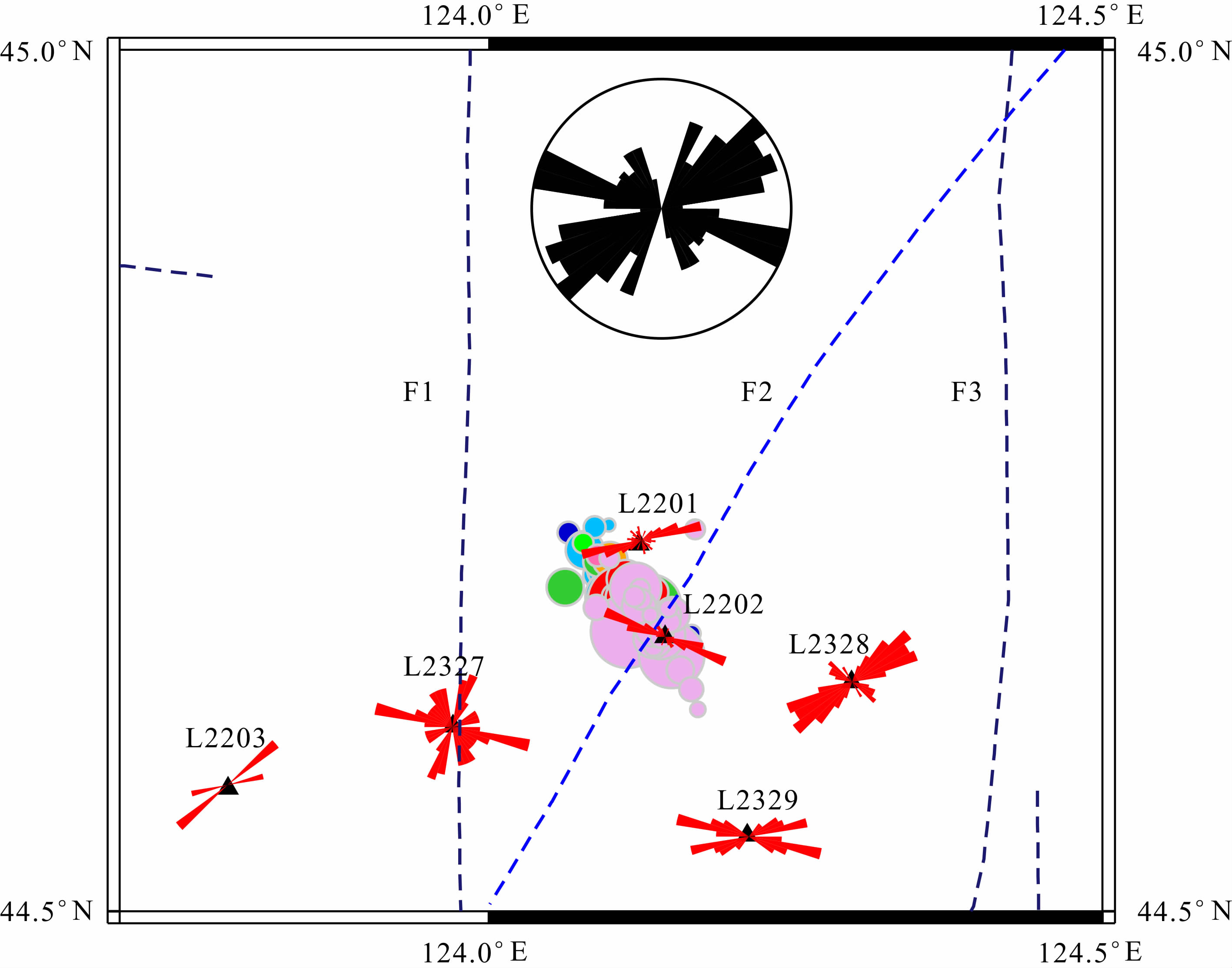 L2201台和L2202台分别位于长岭—大山子断裂的两侧,它们的快波偏振方向有所不同,L2201台的快波偏振方向为北东东向,L2202台为北西向.发震断裂走向为北东向,但是地震簇沿着南东向展布.地震的发生是地壳中应力的突然释放,可以看出L2202台的快波偏振方向受到地震序列的影响较大,与地震的展布方向一致.而位于地震簇北边的L2201台快波偏振方向与断裂走向斜交,为北东东向.位于阿荣旗—开原断裂上的L2327台站快波偏振方向有两个,分别为北东东向和北西向,北东东向的快波偏振方向与断裂的走向近似一致,北西向的偏振方向与断裂走向斜交,但是平行于地震的展布方向;位于研究区域西部的L2203台快波偏振方向为北东向,与阿荣旗—开原断裂带走向斜交;位于四平—大安断裂附近的L2328台表现为北东向的快波偏振方向,与断裂走向几乎一致;而L2329台站的快波偏振方向为北西和北东两个方向.快波偏振方向的结果表明研究区域内各向异性方向较为复杂,主要为北东向和北西向.研究区域内所有的快波偏振方向结果显示快波偏振方向在北西向的一致性较好,在北东向上表现较为零散(图 5).