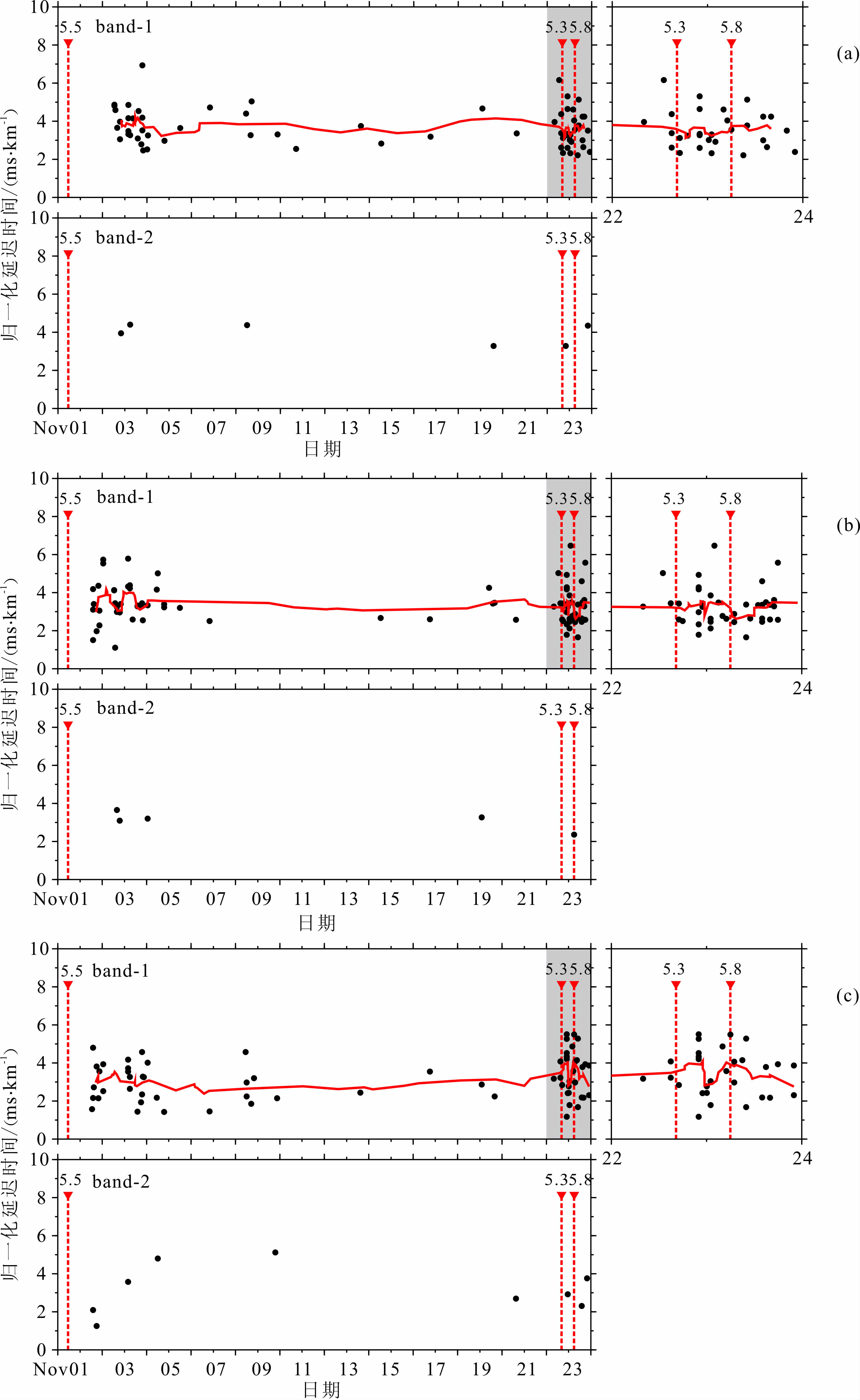 ![]() | 图 6(a)(b)(c)分别为L2201、L2202和L2328台的慢波延迟时间变化 黑色点为归一化的慢波延迟时间结果,红色实线为7点滑动平均的计算结果.红色虚线为2013年10月31日—11月24日 震级大于5级的地震发震时刻.右侧小图为左侧图中阴影区域的放大. Fig. 6 Changes in time-delays at L2201,L2202 and L2328 stations,respectively The black dots are the results of time-delays from all the earthquakes within SWW. The red solid lines are the results of 7 point moving average. The red dashed lines are the time earthquakes(MS>5.0)happened. The small right figure is the enlargement of the shaded area in the left figure. |