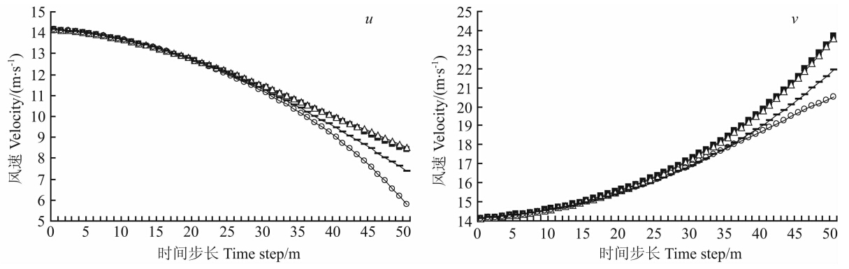 的条件下半解析解的精度,图 3给出了风速的对比结果.无论u还是v,方案3和4在整个时间段内曲线均几 乎是重合的,最大误差为0.02 m·s-1.方案1和2的结果非常接近,在Δt>20 min以后开始和方案4分岔,并逐渐加大.对比位移计算误差结果表明,方案3的误差明显最小,最大误差为0.26 km(图略).由此可见,方案3计算误差的主要根源是气压梯度力时间倾向的线性近似.