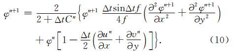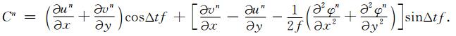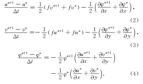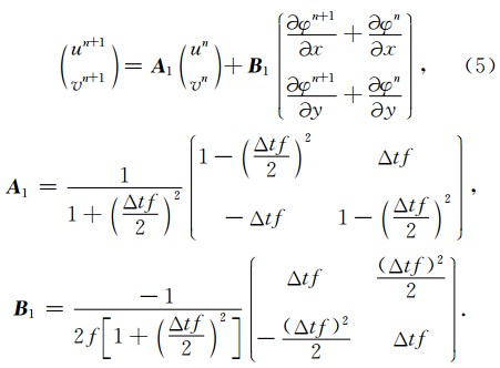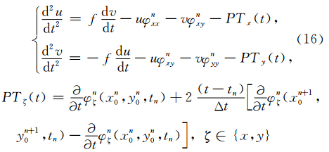 方程(11)为非线性微分方程组,难以求解,需采用线性化近似.设质点在第n个时间层位置为(xn0,yn0),起始速度为un0,vn0.为书写和表达简洁,以下符号中下标为x、y和ζ时均表示偏微分.