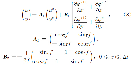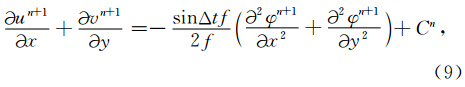 采用差分格式的半拉格朗日数值模式的求解方法通常是将(5)式求散度后代入(4)式消掉n+1时次的散度项,得到φn+1的方程,通过迭代法求得φn+1, 再代入(5)式求解风速.我国自主研发的Grapes模式也是采用这一方案(薛纪善和陈徳辉,2008). 因此不妨检验采用(8)式是否也容易得到类似的关于φ