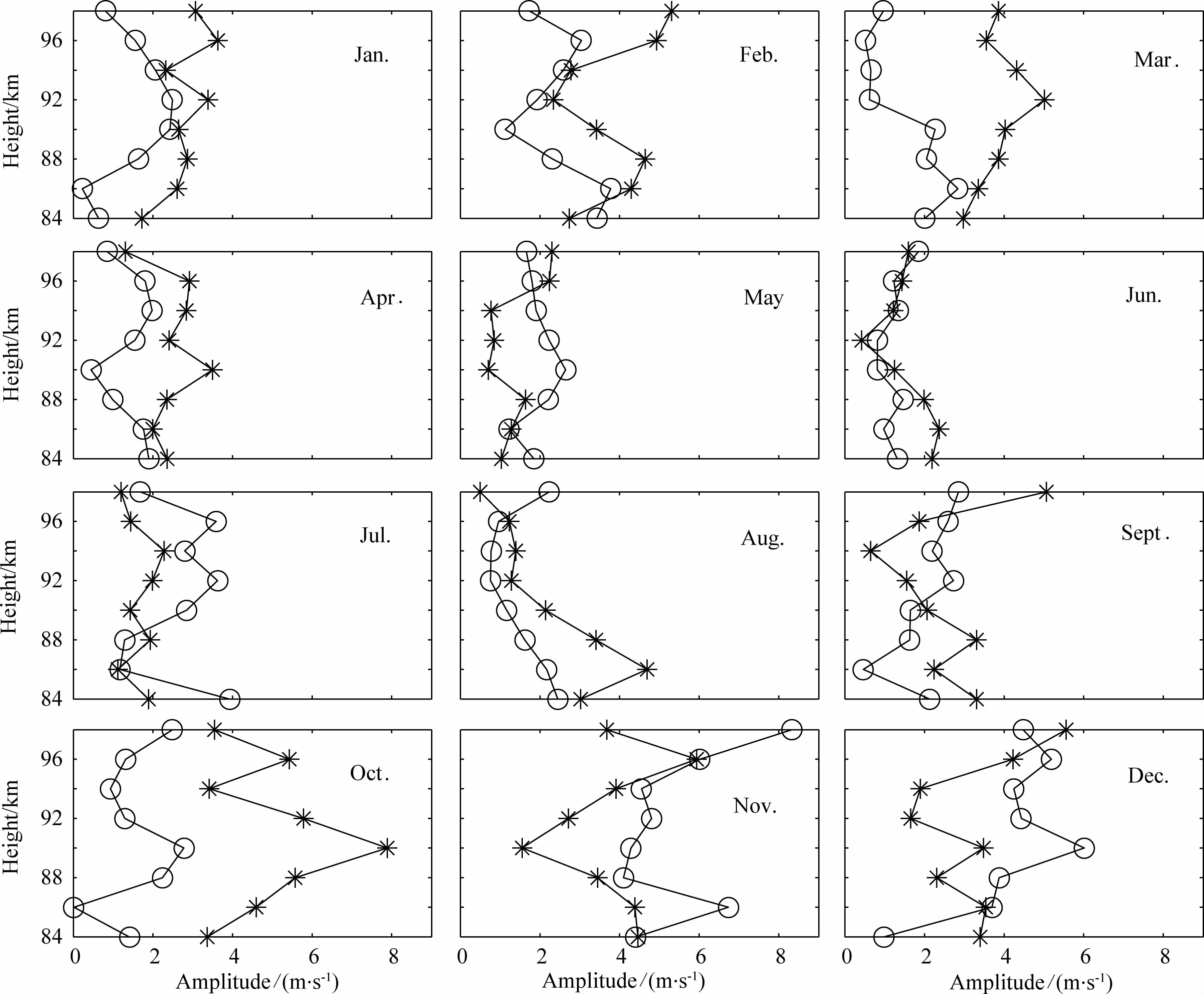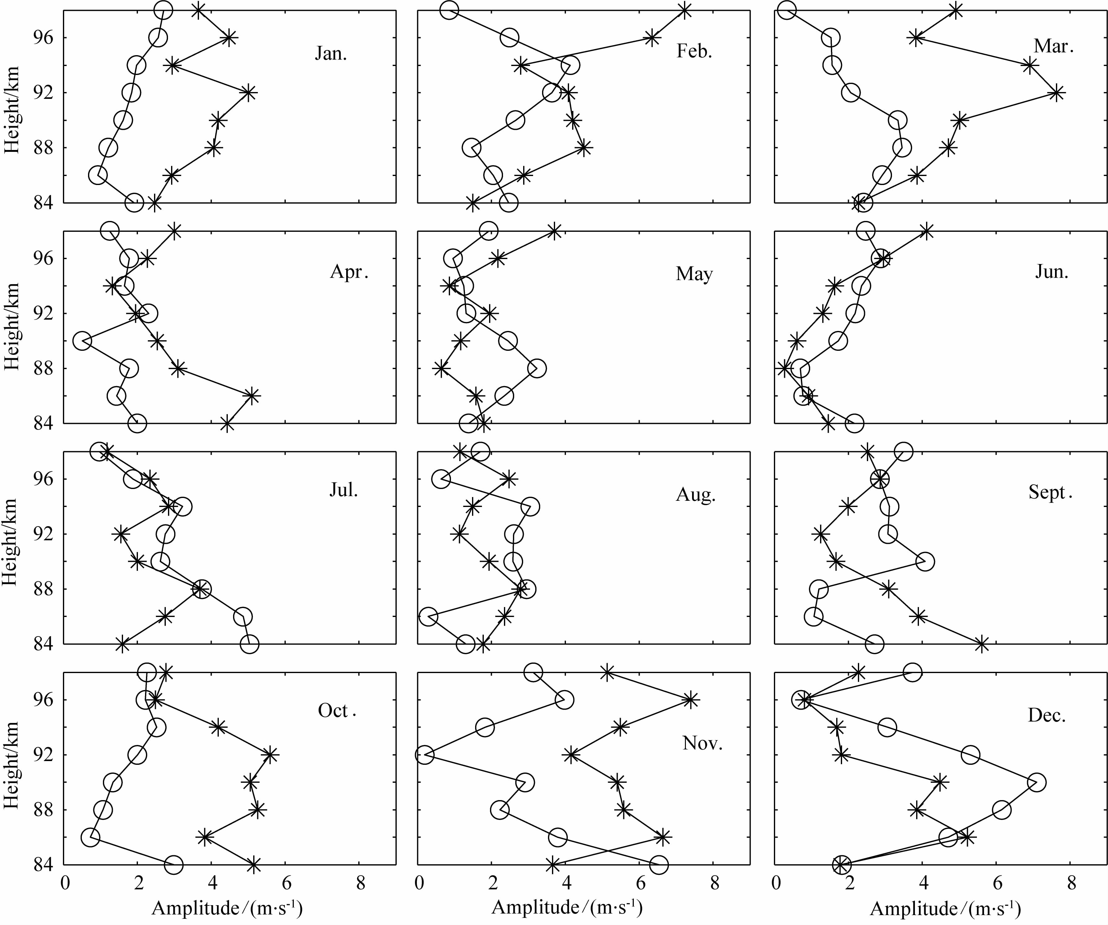 ![]() | 图 2 1—12月份武汉东向太阴M2潮(*线)和N2潮(o线)在80~100 km高度上的幅度 Fig. 2 The amplitudes of the eastward M2(* line) and N2(o line)lunar tide in Wuhan from January to December at 80~100 km heights |
