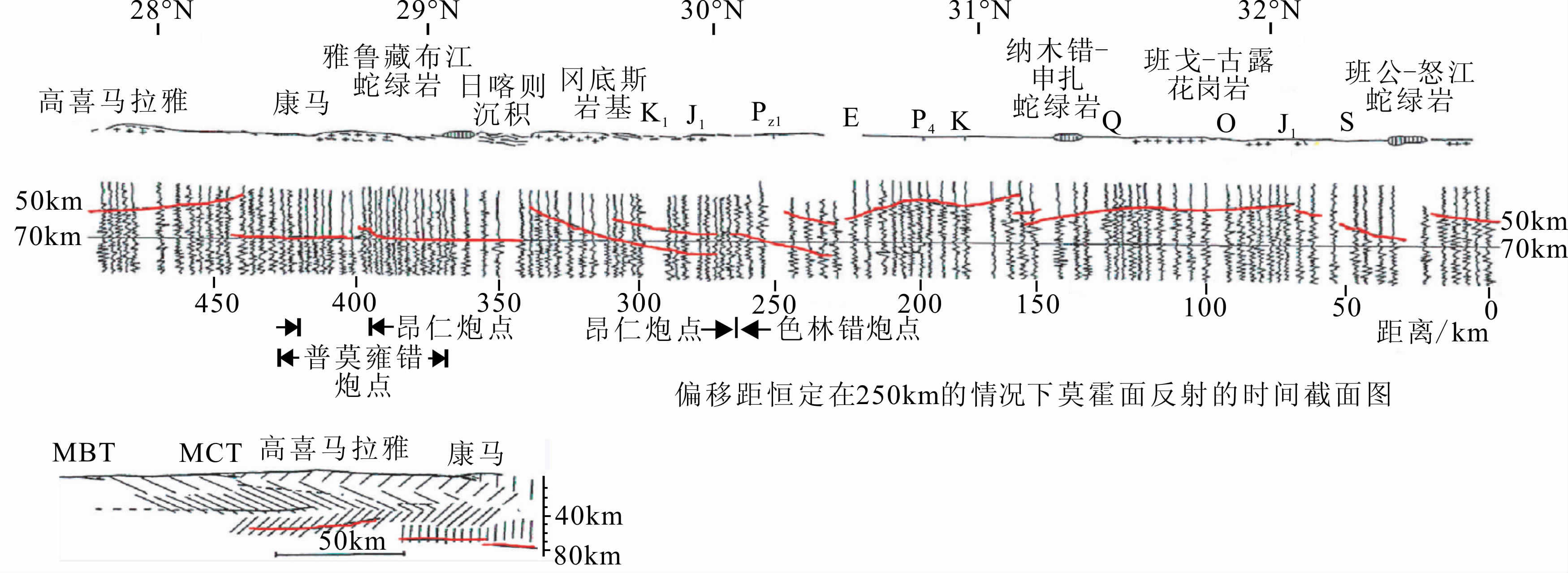 ![]() | 图 1 亚东—当雄以西130 km处南北向新吉—塔马—孜松地带扇形地震剖面 与Moho界面起伏(Hirn et al., 1984a,b;滕吉文等,2012) Fig. 1 North-south seismic profile and Moho relief of Xinji-Dama-Zisong area about 130 km west of Yadong-Dangxiong(Hirn et al., 1984a,b; Teng et al., 2012) |