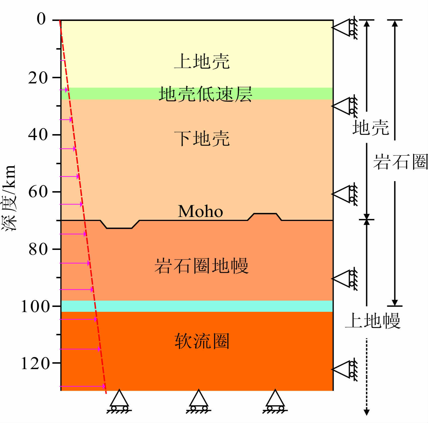 根据Klemperer 等(2006)和张培震(2008)研究 工作认为,在青藏高原东部与南部,更可能是Poiseuille 流而非Couette流的方式.因而,本研究工作的初始边界条件设置为Poiseuille流模式,即在左边界施加由高原重力加载随深度变化的静岩压力,为了减小各层之间由于密度差所带来的影响,抵消重力效应,模型左端除施加静岩压力外(数值上为3倍静水压力值),深部每一圈层均增加与上方所有圈层由于密度差导致随深度变化的压力差值.这样,边界驱动的压力从数值上大为减小了重力对边界力抵消所带来的影响,并确保模型的力源约束属于Poiseuille流方式.在边界条件的选取中,模型底部施加竖直向约束,使其水平向能自由移动.模型的右边界施加水平方向的约束,在竖直方向上自由移动.为便于计算,以上模型的外部边界几何模型均设定为直立或是水平.