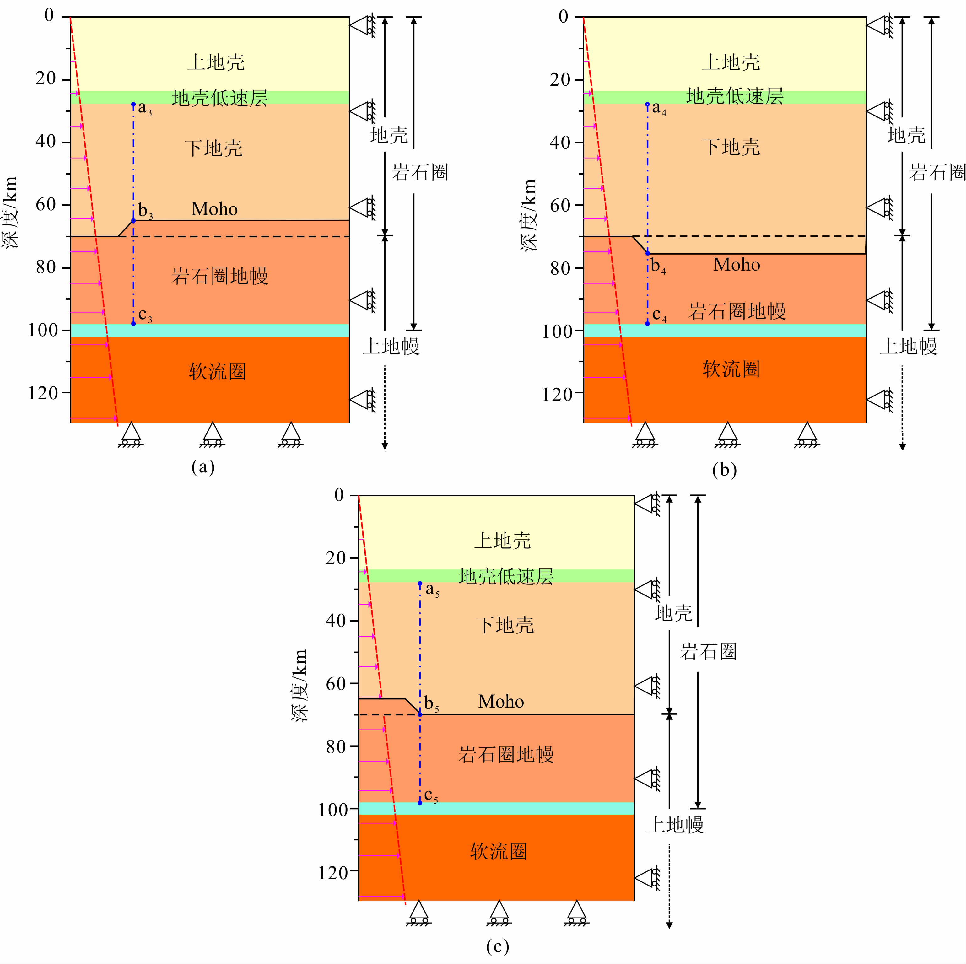 模型1:壳、幔速度结构考虑两个低速层,几何结 构考虑Moho界面的起伏.(a)上地壳厚度为23 km,Vp=5.9±0.1 km·s-1;(b)下方23~30 km深度 处为低速层,Vp=5.7±0.1 km·s-1;(c)30~70 km处为下地壳,Vp=6.7±0.1 km·s-1;(d)岩石圈地幔,即上地幔盖层位于70~97 km深处,Vp=8.1± 0.1 km·s-1;(e)软流圈顶部滑移面,位于深部97~103 km之间,Vp=7.8±0.1 km·s-1;(f)深度103~150 km之间为软流圈,Vp=7.4±0.1 km·s-1.